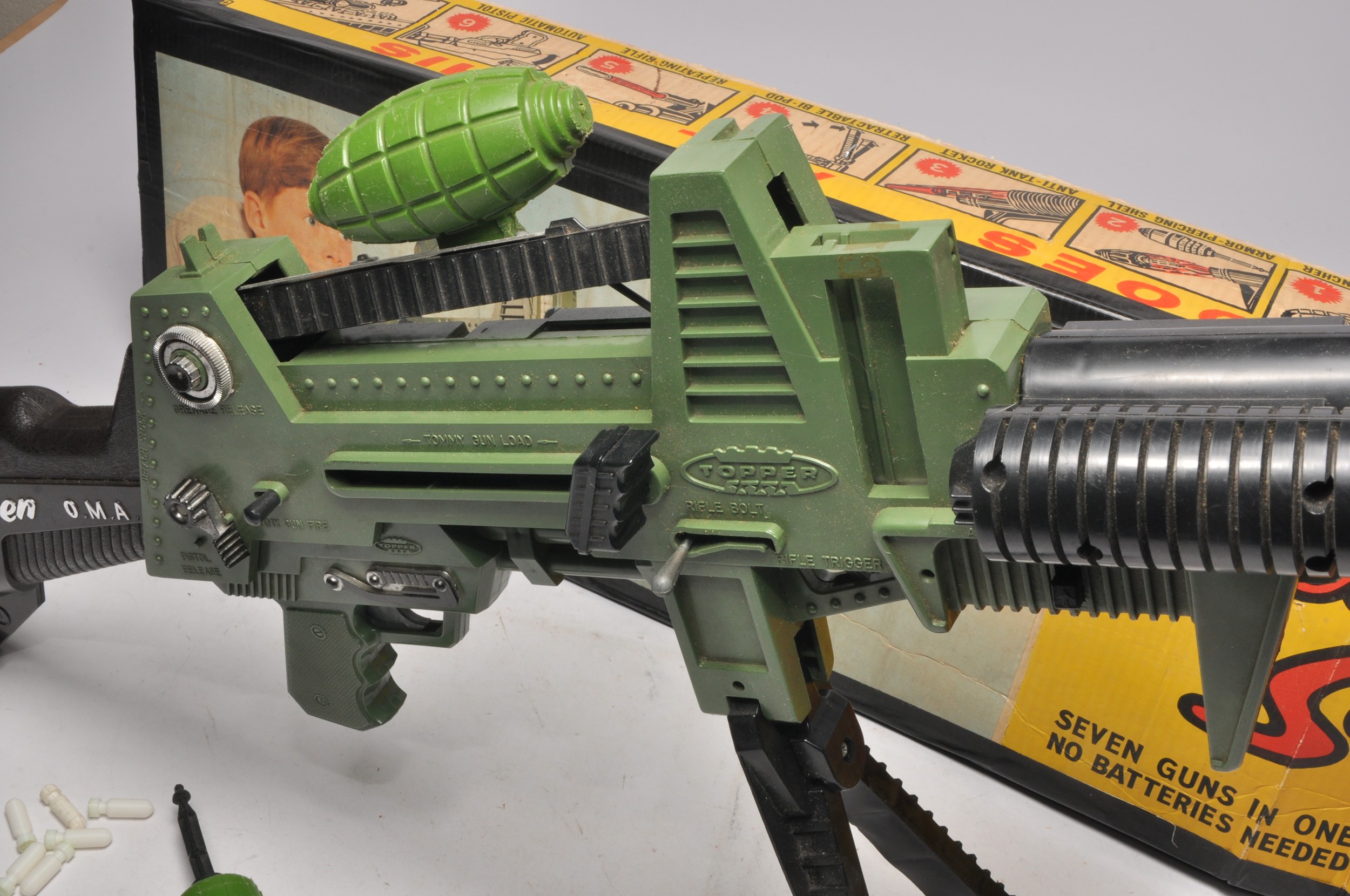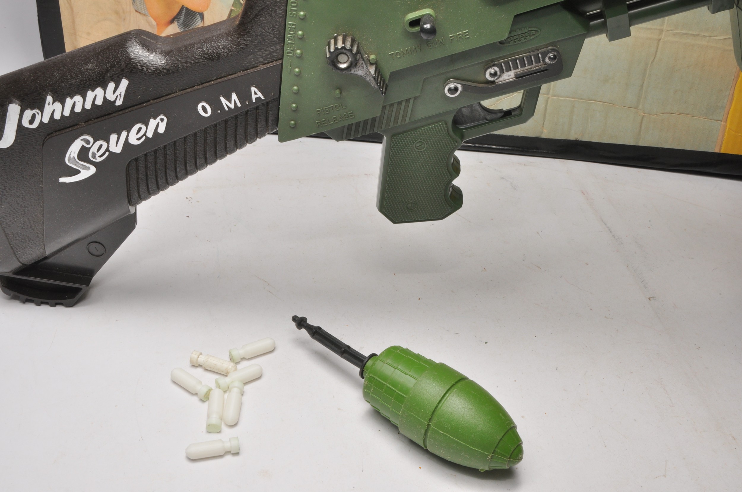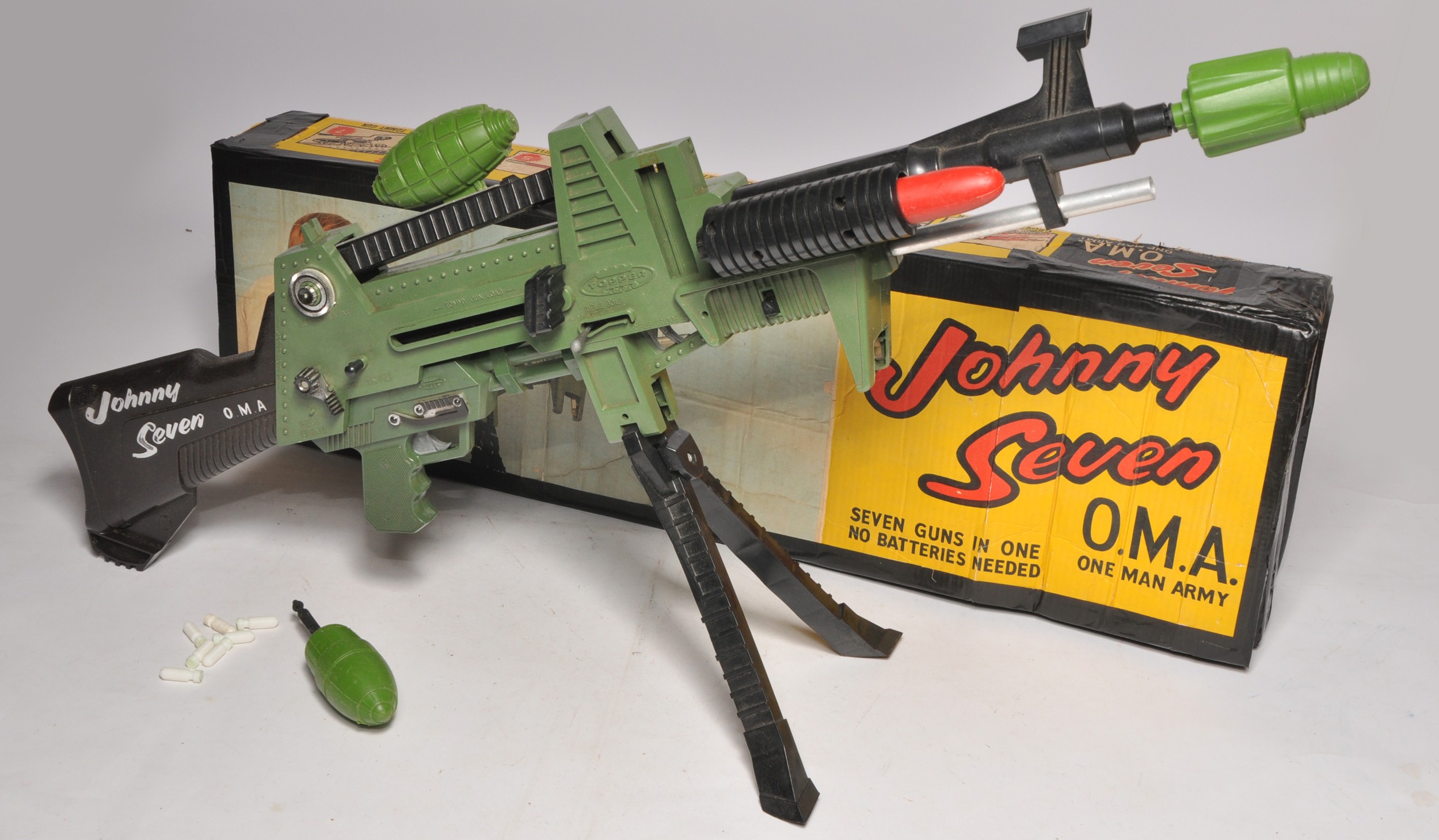 Topper Toys Johnny Seven O.M.A. Gun appears to be complete, in clean condition and in working order. With original box. Note original box has been notably repaired with tape and reinforced wooden struts inside.