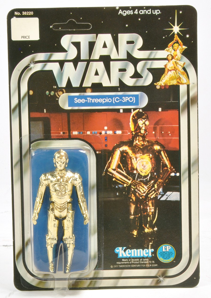 Kenner Star Wars Original Carded Figure comprising See-Threepio (C-3PO) . Factory sealed with no evident faults to bubble. Figure is on 12 back card. Card is unpunched and generally excellent with little sign of wear. With acrylic presentation case. Very hard to find in this condition, likely very high grade.