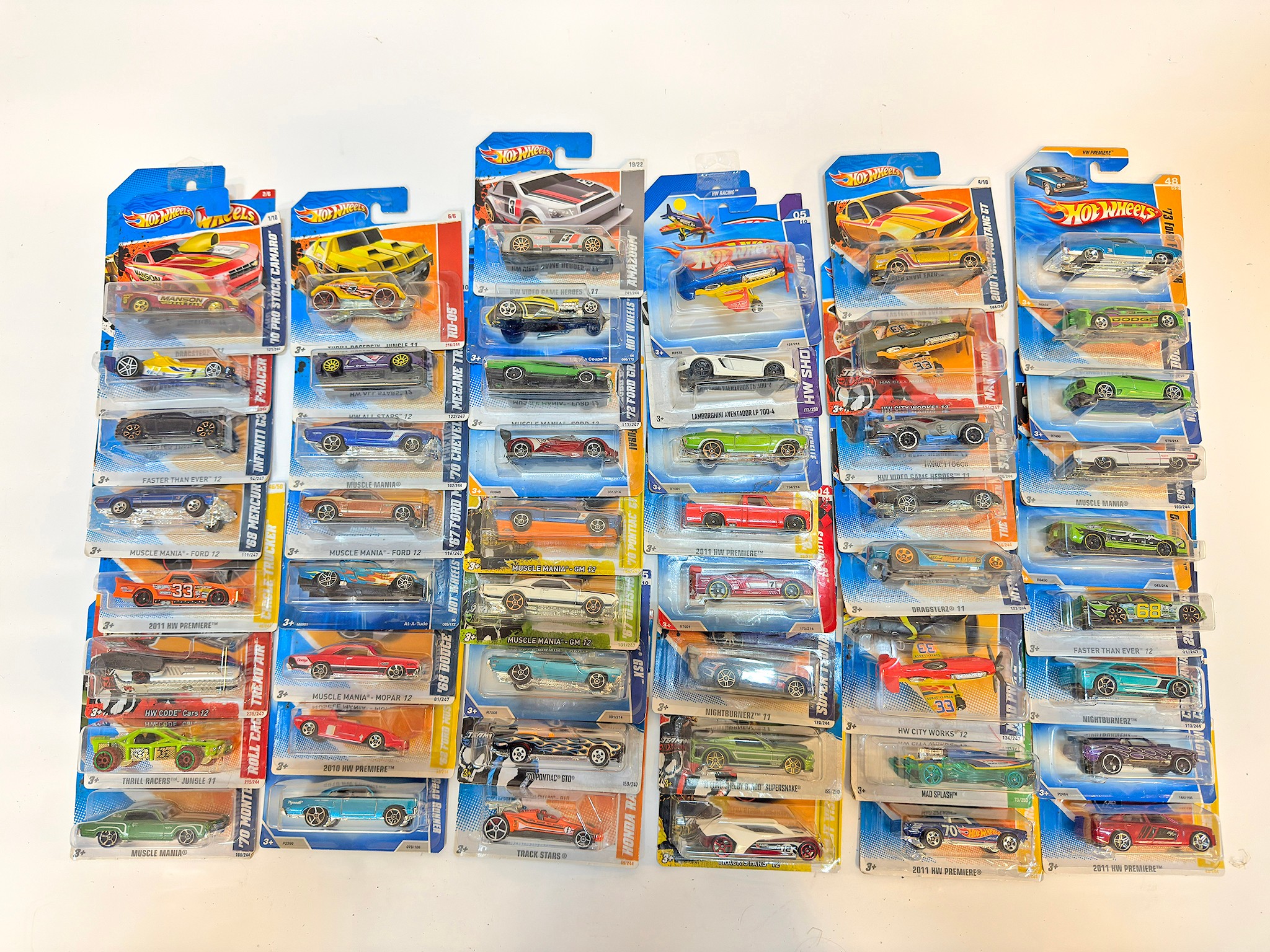 A group of 50 Hot Wheels carded diecast model vehicles comprising 1) Hot Wheels 70 Buick GSX, 2) Hoit Wheels 67 Oldsmobile 442, 3) Hot Wheels 70 Pontiac GTO Judge, 4) Hot Wheels 70 Pro Stock Camaro, 5) Hot Wheels 2010 Ford Mustang GT , plus others as shown. All appear excellent in original boxes.