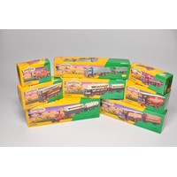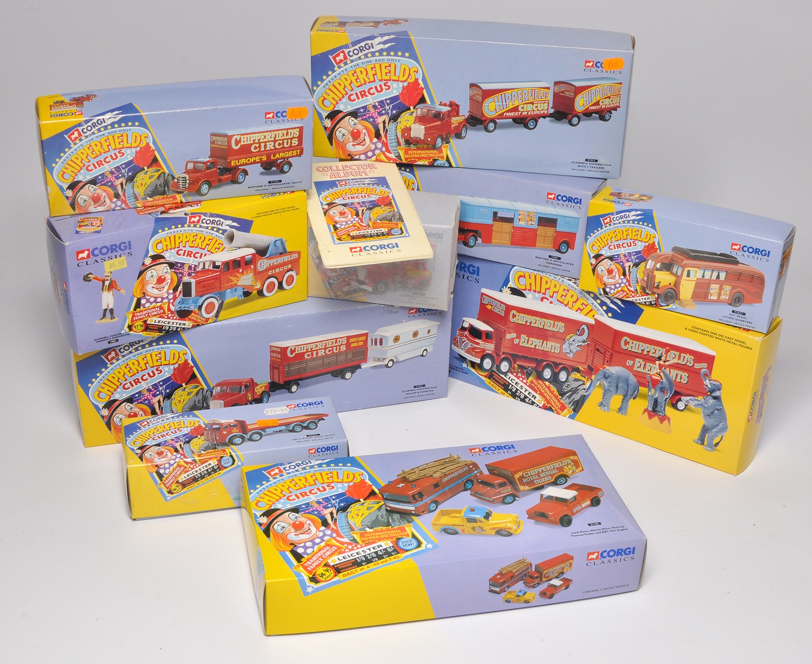 A group of 10 x Chipperfields circus diecast model vehicles to include trucks and commercial vehicles. Individual models comprise 1) Corgi Classics Chipperfields Circus Scammell Constructor CanNo. n & Ringmaster, 2) Chipperfields Circus AEC Regal Living Quarters, 3) Corgi Classics Chipperfields Circus Land Rover, Moris MiNo. r, Pick-up, Thames Trader & AEC Fire Engine, 4) Corgi Classics Chipperfields Circus Foden S21 Lorry & Trailer With Elephants, Pedestal & Rider, 5) Corgi Classics Chipperfields Circus Scammell Highwayman Trailer & Caravan , plus others as shown. All appear mostly excellent in original boxes, from an ex-shop collection.