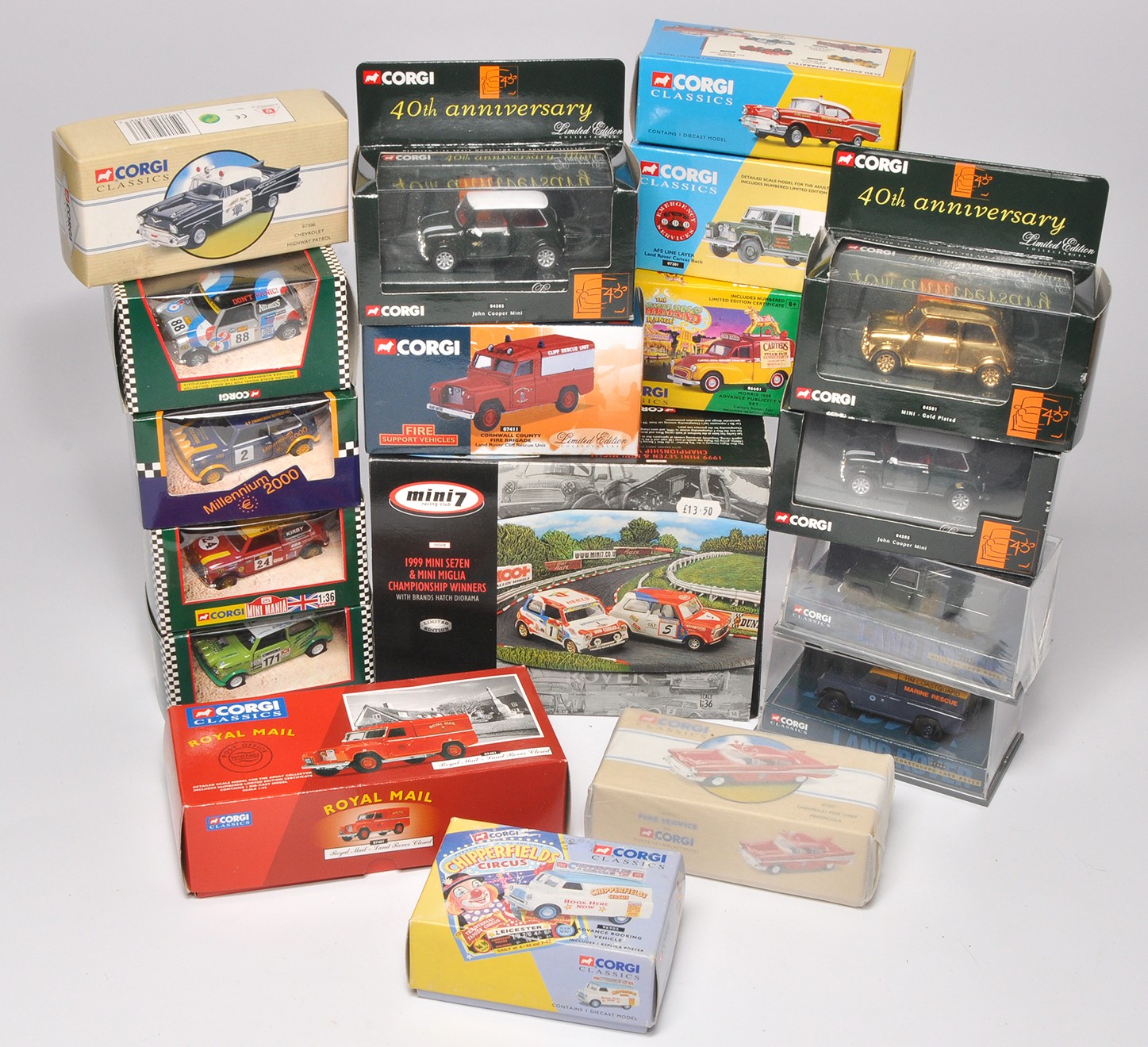 A group of 18 x diecast model vehicles to include cars & vans. Individual models comprise 1) Corgi Classics Chipperfield Circus Advance Booking Vehicle, 2) Corgi Classics AFS Line Layer Land Rover Cancas Back, 3) Corgi Classics Coastguard Land Rover, 4) Corgi Mighty Minis Racing No.88 Neil Burgess, 5) Corgi Mini7 Racing Club 1999 Mini Se7en & Mini Miglia Championship Winners With Brands Hatch Diorama , plus others as shown. All appear mostly excellent in original boxes, from an ex-shop collection.